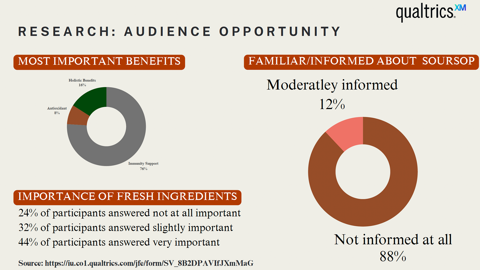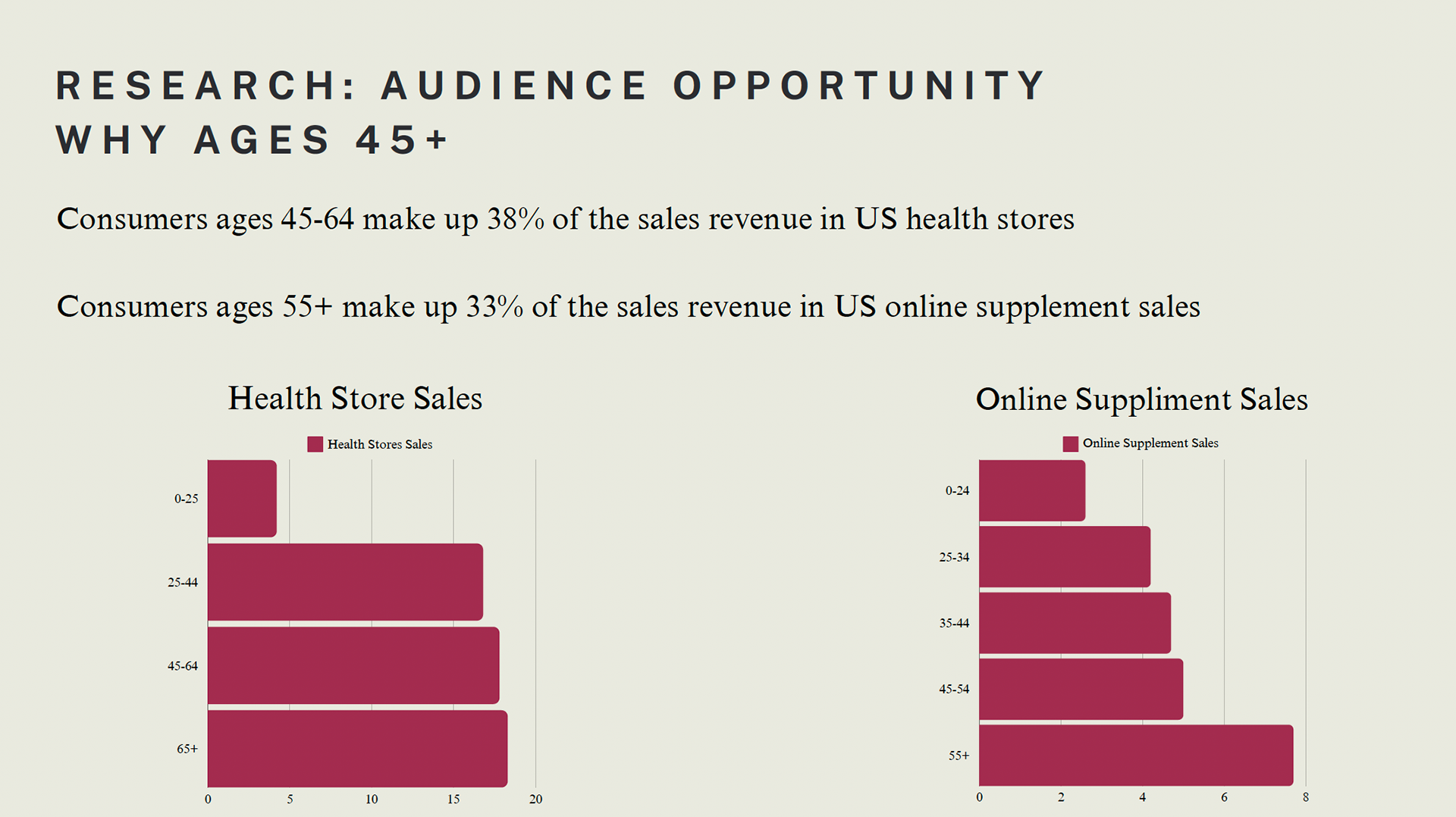 Through Surveys and market research, we found that the target audience for the brand was women ages 45-60. I also found that the vast majority of US online supplement sales come from consumers ages 55+. Through surveys with our target audience, we found that consumers were attracted to fresh ingredients, immunity support, and had little or no exposure to the brand.